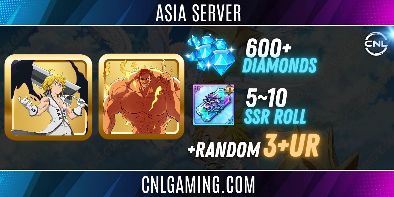 Start your journey in 7DS - The Seven Deadly Sins: Grand Cross with this premium Asia Server account, featuring 600+ Diamonds, 3+ Random UR, 5-10 SSR Rolls, and UR Meliodas + The One Escanor. Get a strong head start and enjoy fast delivery for instant access!