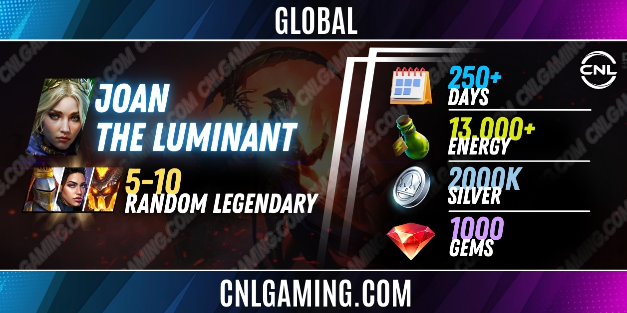Global Joan the Luminant + 5-10 random Legendary | 250+ Days | Energy 13000+ | Silver 2000K | 1000 Gems