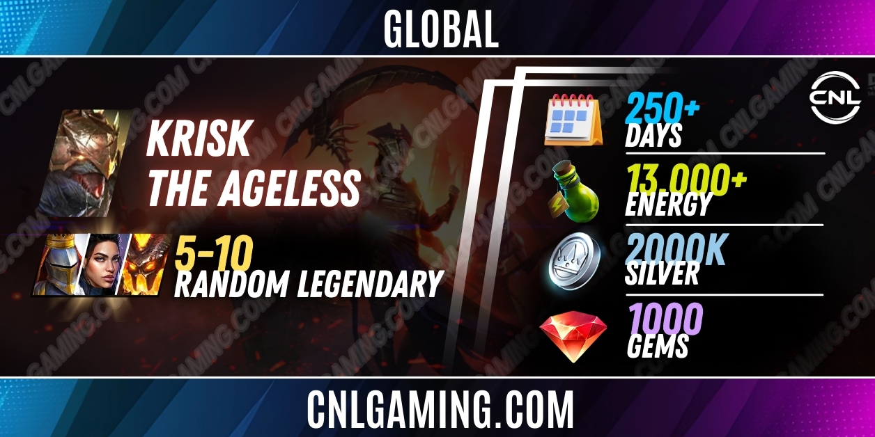 Global Krisk the Ageless + 5-10 random Legendary | 250+ Days | Energy 13000+ | Silver 2000K | 1000 Gems