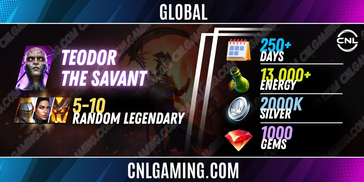 Global Teodor the Savant + 5-10 random Legendary | 250+ Days | Energy 13000+ | Silver 2000K | 1000 Gems