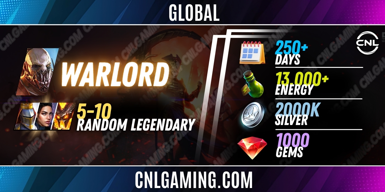Global Warlord + 5-10 random Legendary | 250+ Days | Energy 13000+ | Silver 2000K | 1000 Gems